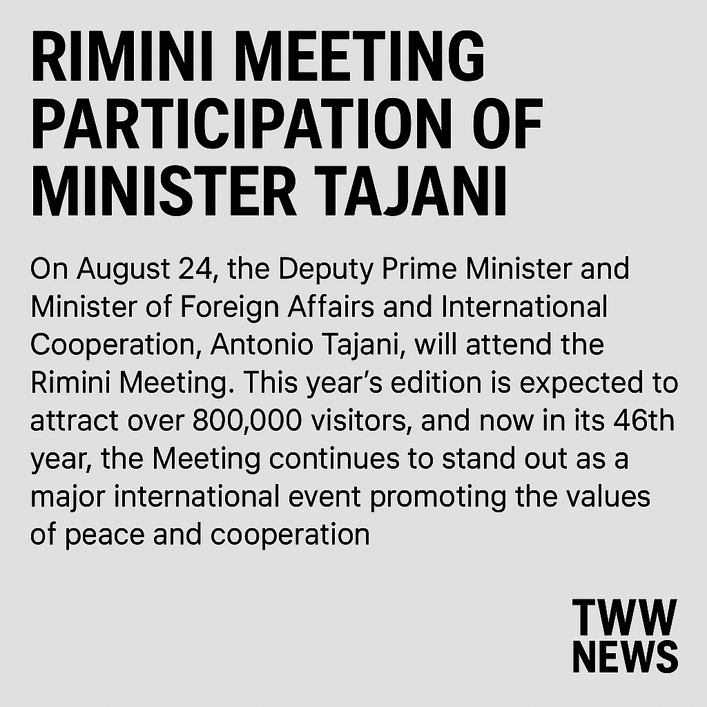 Rimini, August 24 — Italy’s Deputy Prime Minister and Foreign Minister, Antonio Tajani, is set to participate in the 46th…