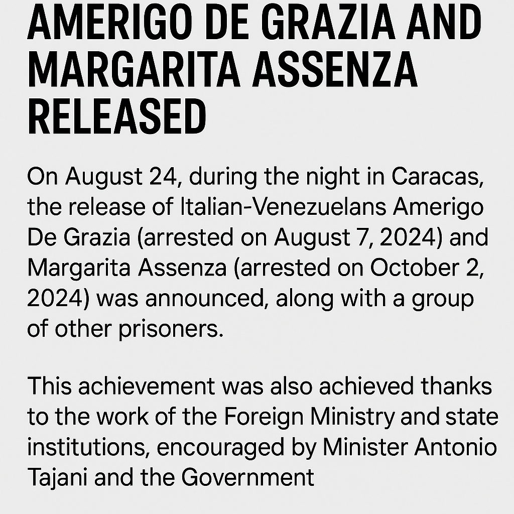 Caracas, August 24 — In a late-night development, Italian-Venezuelans Amerigo De Grazia and Margarita Assenza were released from detention, alongside…